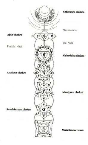 por el interior de la columna vertebral, mientras que iḍā y piṅgalā